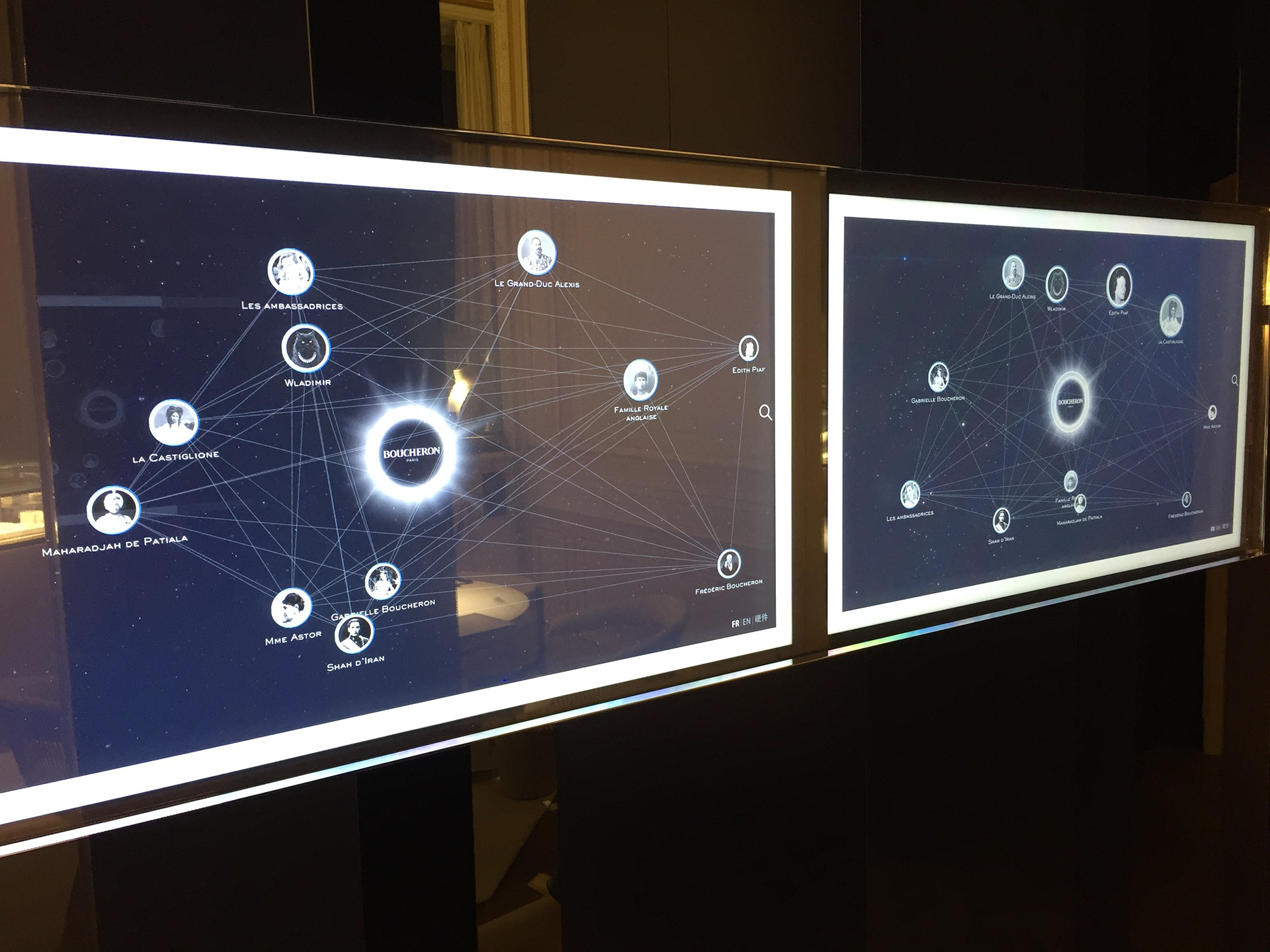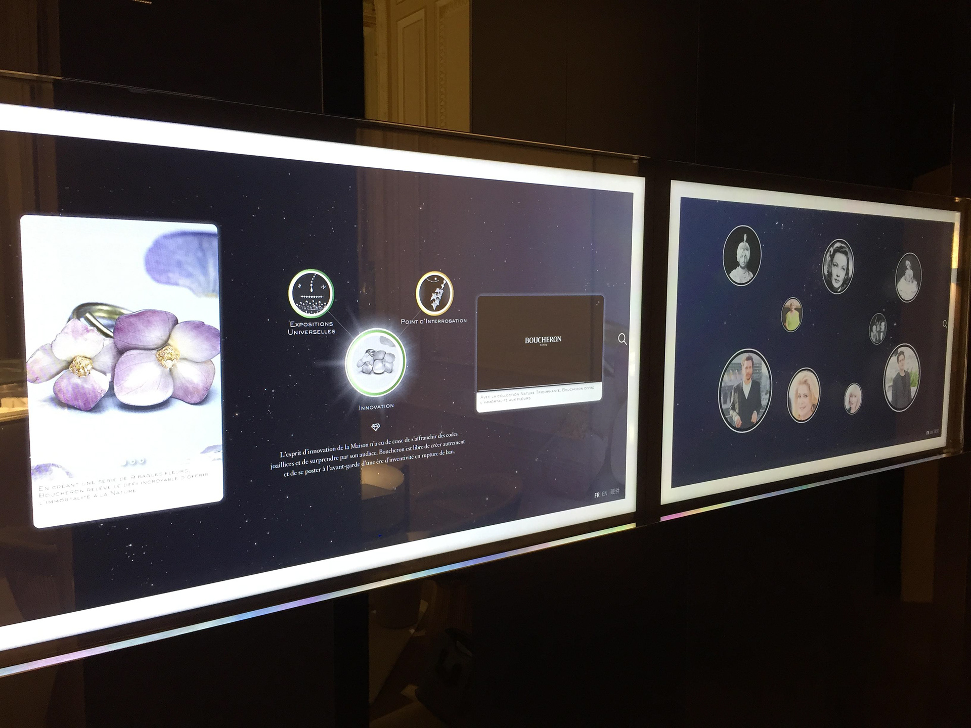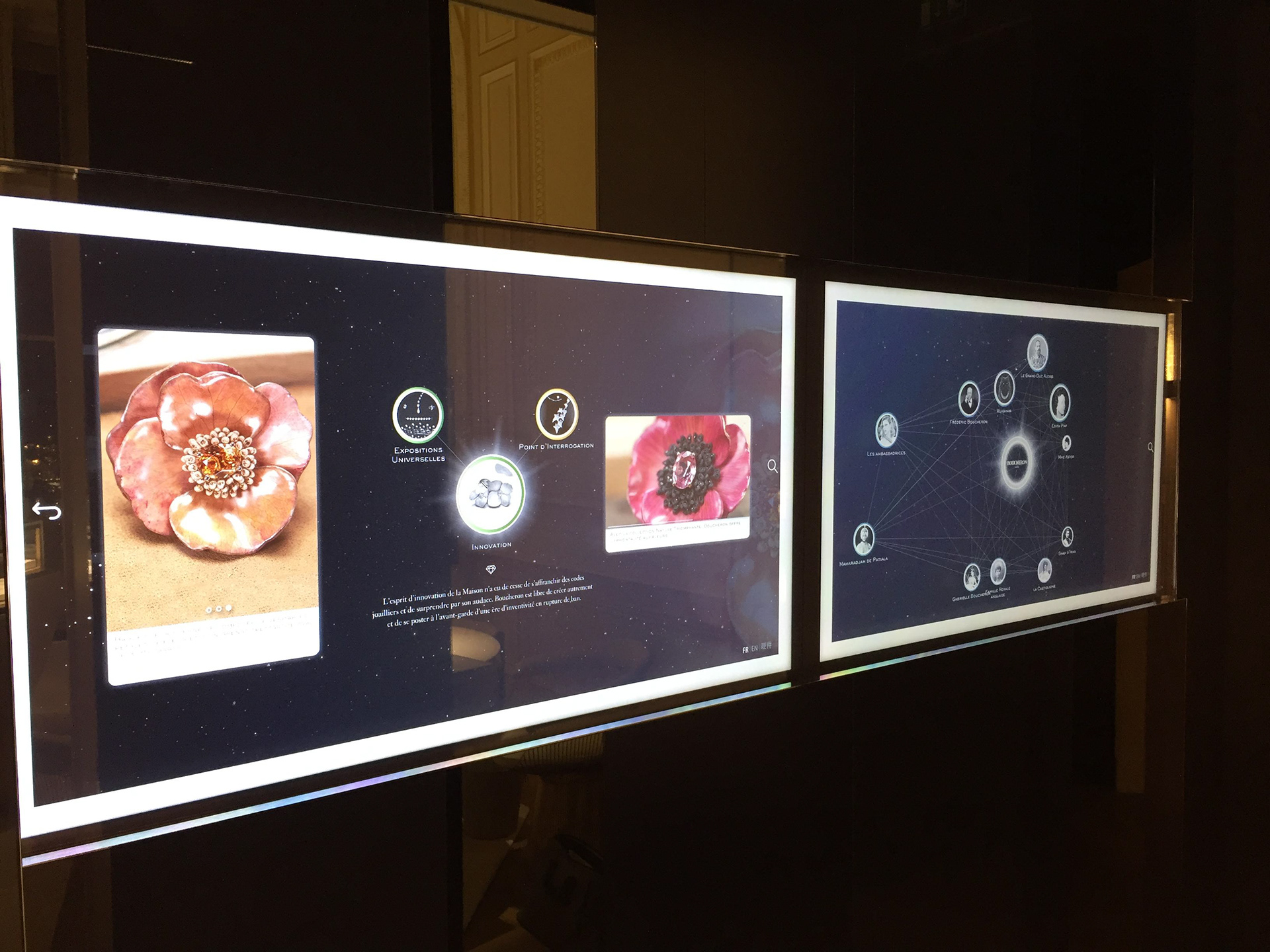 Development of an in-store interactive application for Boucheron headquarter in place Vendôme, Paris, to showcase brand's history and product line.